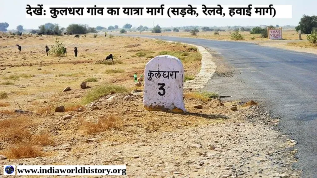 बाड़मेर से दूरी: बाड़मेर से कुलधरा पहुंचने के लिए। करीब 160 किलोमीटर का रास्ता तय करना पड़ता है। जिसमें राज्य राजमार्ग से लगभग 3 घंटों का समय लगता हैं।